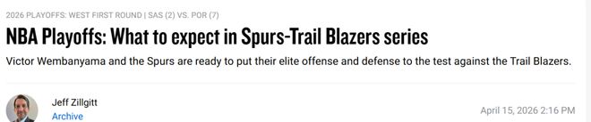 北京时间4月15日,NBA附加赛,开拓者击败太阳,成为西部7号种子,他们的首轮对手是马刺。NBA官网撰文前瞻这轮系列赛,并预测马刺最终4-1淘汰开拓者,晋级西部半决赛。以下是相关内容——